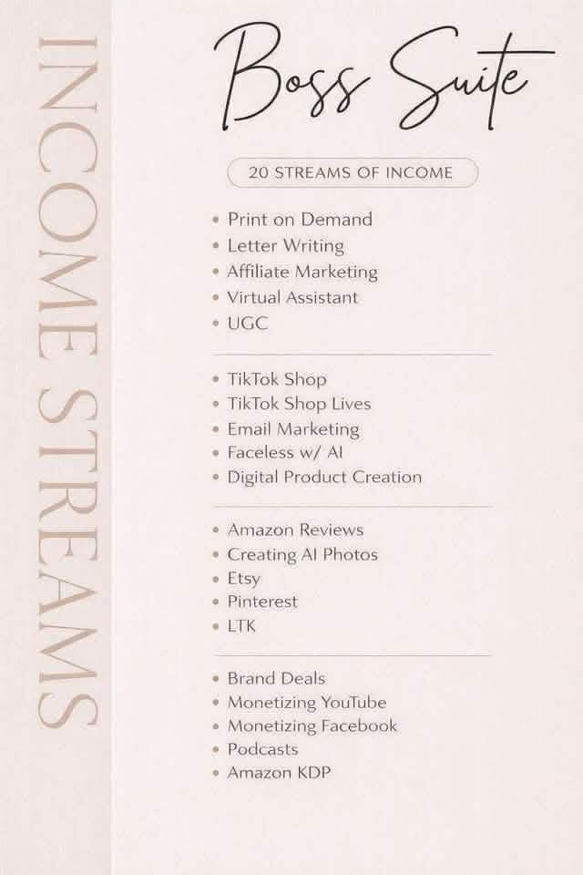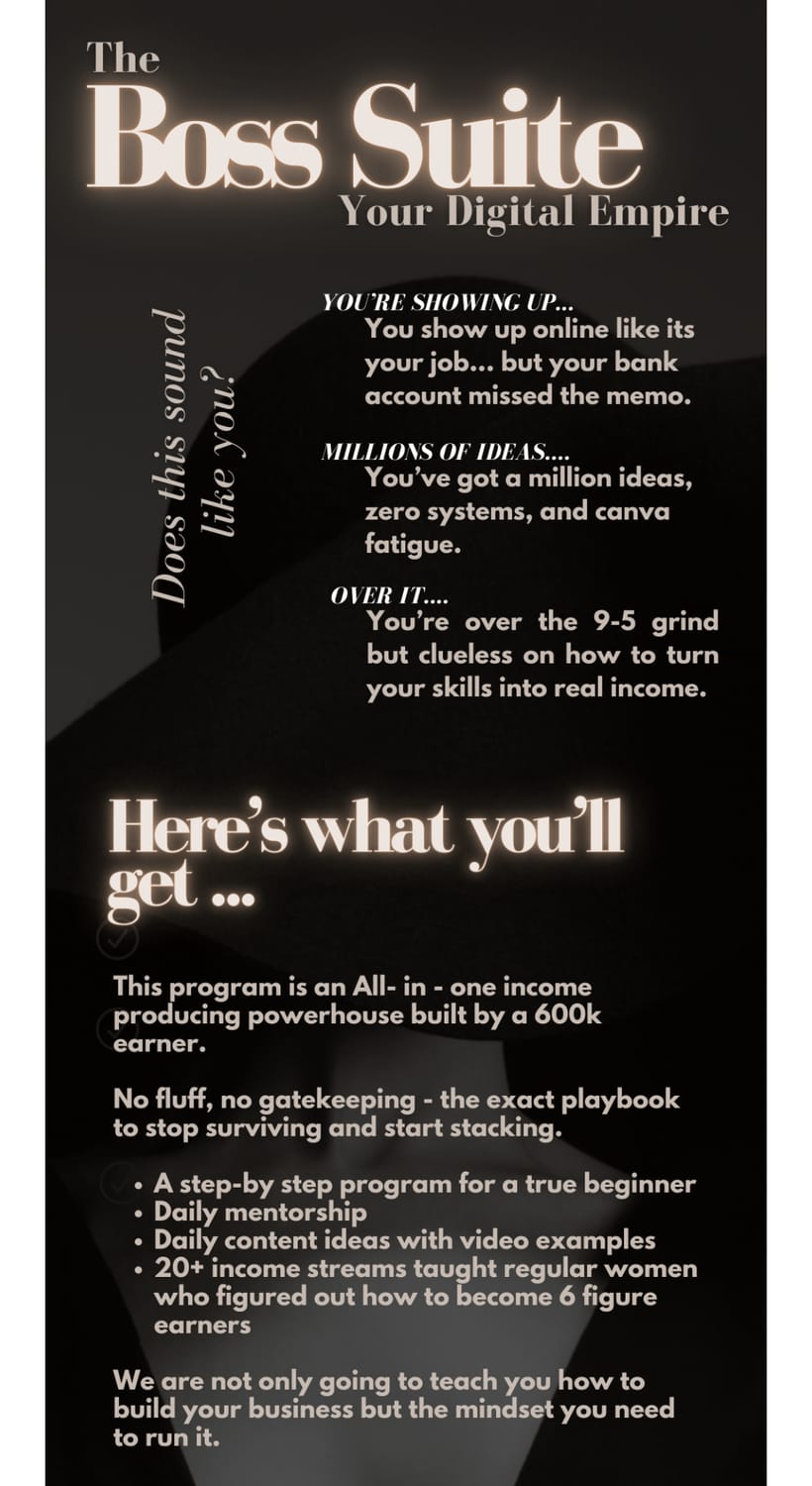 Whether you’re just starting or leveling up, The Boss Suite gives you the systems, strategy, and structure to grow your business with ease and keep your income on autopilot: